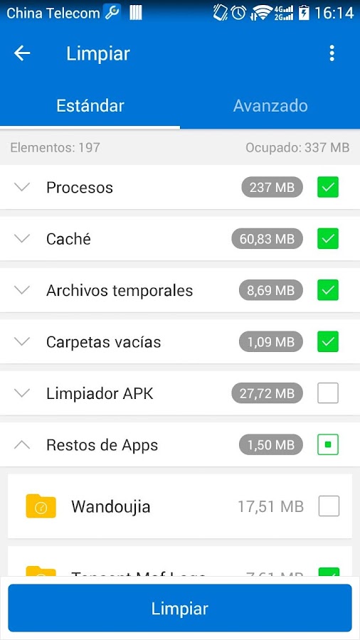* Se deshace de paquetes apk no deseados, borra carpetas vacías y miniaturas.