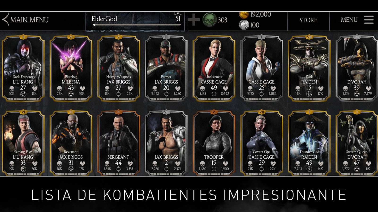 Colecciona veteranos de Mortal Kombat como Scorpion, Johnny Cage, Sub-Zero, Sonya, Kitana, Ermac, y muchos otros. Descubre los nuevos personajes de Mortal Kombat como la insectoide D'Vorah, la intensa Cassie Cage, el sanguinario Kotal Khan y el misterioso Kung Jin.