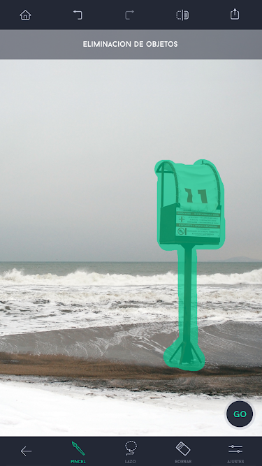 Elimina distracciones de las fotos con la herramienta Eliminar Objetos —selecciona Cepillo o Lazo, marca el contenido que quieres eliminar y después pulsa el botón Go.